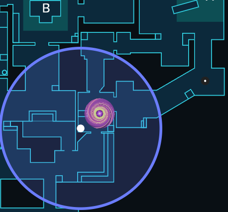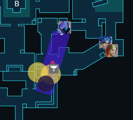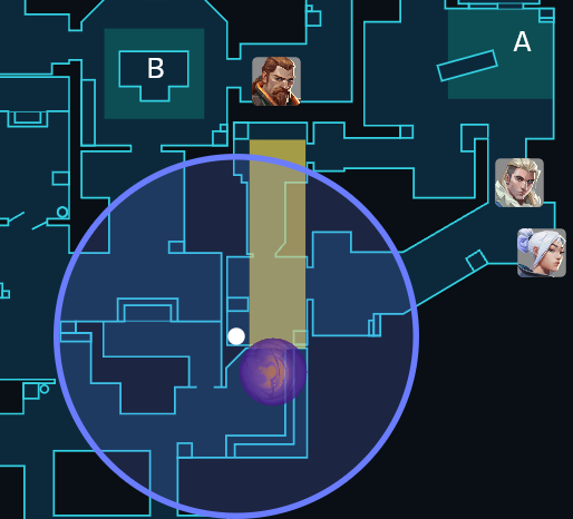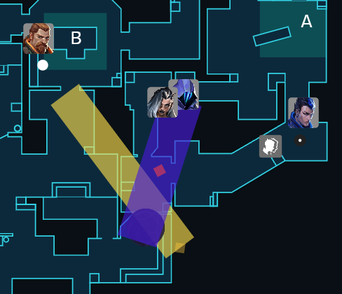 If we slot a Jett into the corner we now have a very strong way of denying early attacker positioning on A with only two bodies (Breach can rotate quickly wherever he’s needed). Suppose we wanted to replace Jett with Neon, Sova with Skye, and Astra with Omen. The early contest might look something like this.