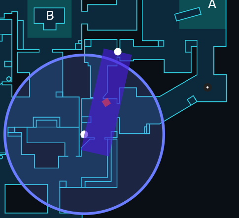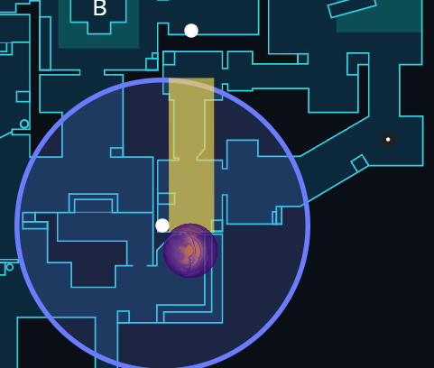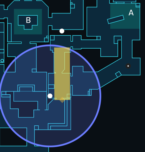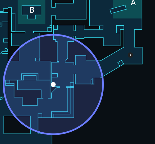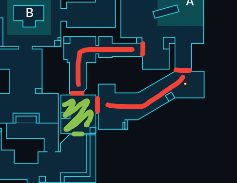 How can we apply the same framework from my last post to A long control on defense? First, lets broaden our view a bit and look at the adjacent areas to long. Attacking teams interested in taking A site almost always need either long or sewers control to enable their site hit. A lobby, importantly, feeds into both long and sewers. Defenders who manage to take control of lobby before the attackers can take either lane can therefore maintain control of both long and sewers with less investment (and earlier information to inform rotations) than would be required to control both lanes without lobby control.