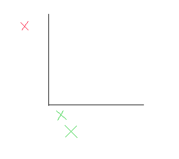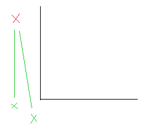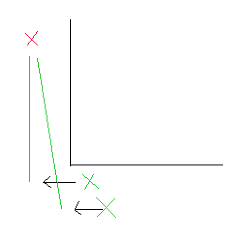 Suppose you are the player represented by the red X in the diagram below and that you’re holding for a swing from the corner. Assume that a singular player swings you, first from the green X closer to the corner, and then from the X farther from the corner. Which starting position will result in a bigger disruption of your crosshair placement?